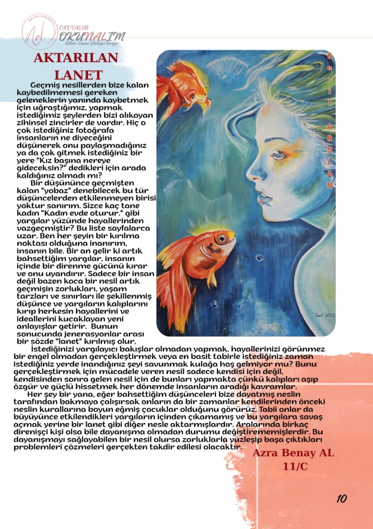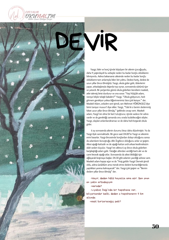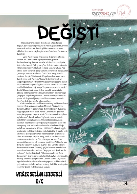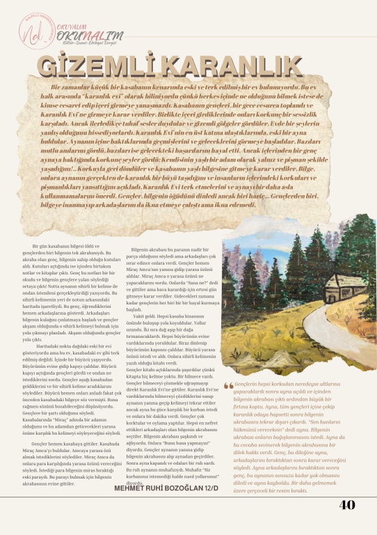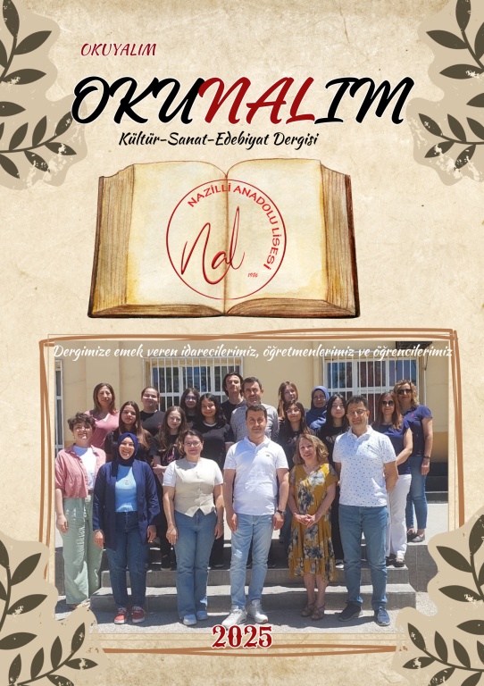 Nazilli Anadolu Lisesi öğrencilerinin Türk Dili ve Edebiyatı Öğretmeni Menduh Arslan'ın rehberliğinde hazırladığı okul dergimiz OKUNALIM 2. sayısıyla yayında. Okulumuz öğretmen ve öğrencilerinin katkı sunduğu dergimizin dizgisini okulumuz Bilişim öğretmeni Betül Öztürk yaptı. Katkıda bulunan tüm öğrenci ve öğretmenlerimize teşekkür ederiz. Dergimizin pdf baskısını indirmek için